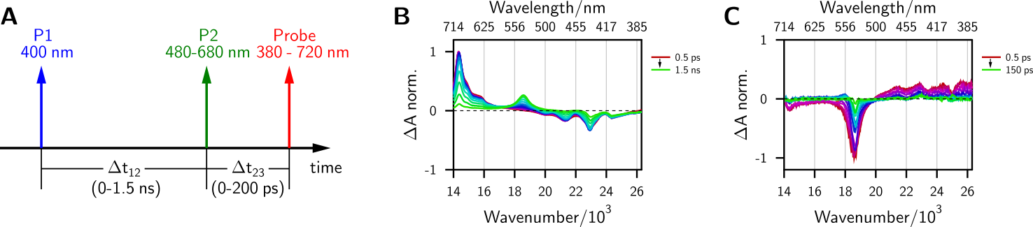 This is a technique where a pump first triggers a photochemical or photophysical process - an example is shown in Figure B of a transient absorption experiment in which perylene is quenched by an electron acceptor to form the perylene cation (new band at ~540 nm). Another pump pulse, tuned to the band of interest (in this case the band at 540 nm) is then used at a given delay after the first in order to achieve transient absorption measurement on the new species. In this way, anions and cations can be generated by photoinduced electron transfer and then their excited dynamics studied. An example of this PPP spectroscopy is shown above in Figure C, where the perylene cation prepared by photochemical reaction is studied.