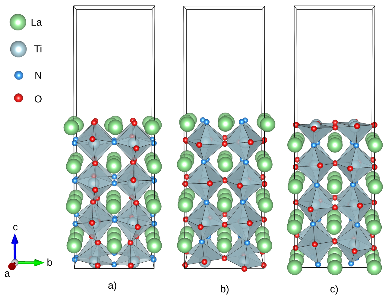 a) LaO (0.980 J/m2), b) LaN (0.542 J/m2) and c) TiO2 (0.654 J/m2) terminations of the (001) surface for the energetically most preferential bulk anion order.