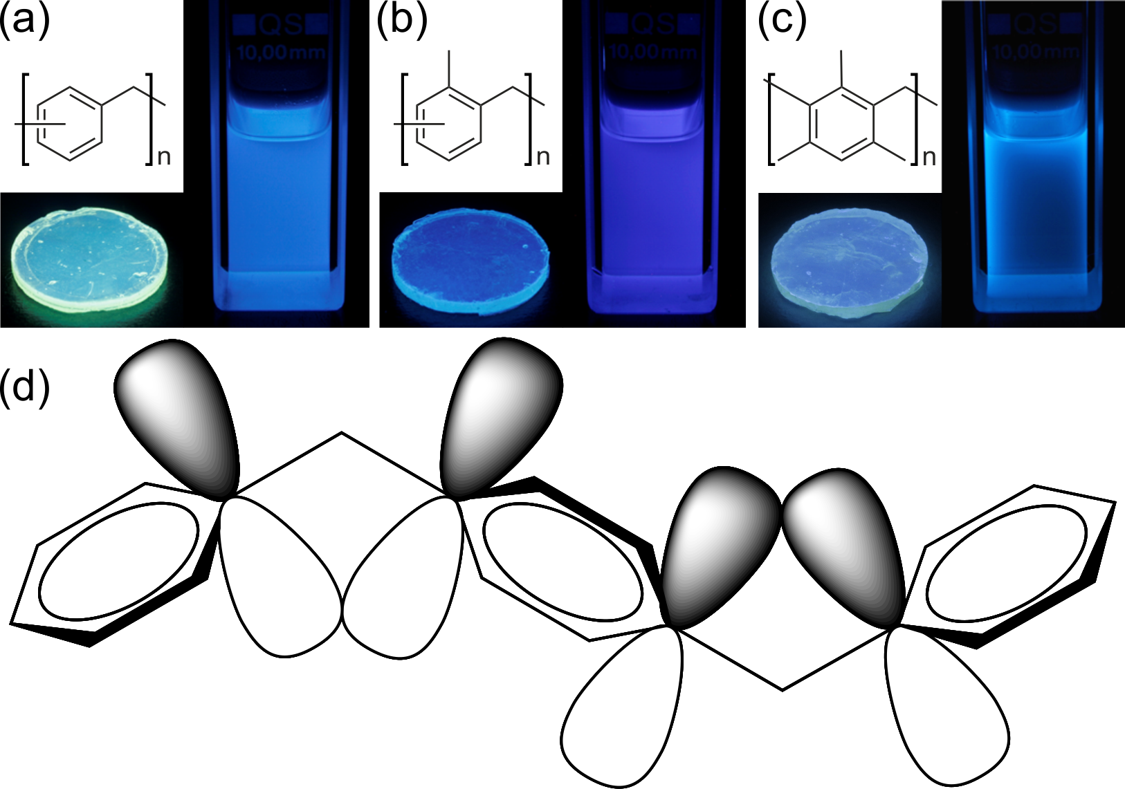 Poly(phenylene methylene) (PPM) exhibits pronounced blue fluorescence in solution as well as in solid-state (Fig. 1(a)), despite its non-conjugated nature along the backbone since the methylene groups interrupt π-conjugation between the phenylene groups. We extensively used optical spectroscopy to explore the characteristics of PPM, namely absorption between 350 nm and 450 nm with the corresponding photoluminescence in the 400-550 nm spectral region [1]. Given the evidence, π-stacking and aggregation, as well as the formation of fluorescent impurities, are excluded as the probable origins of the optical properties. Instead we have shown that its unexpected fluorescence originates in a phenomenon called homoconjugation, specifically the π-orbital overlap of adjacent phenylene groups across the non-conjugating methylene group mediated by particular chain conformations (cf. Fig. 1(d)) [2]. To further confirm the generality of the spectroscopic properties of PPM, two derivatives poly(2-methylphenylene methylene) and poly(2,4,6-trimethylphenylene methylene) were synthesized and found to exhibit comparable spectroscopic properties (Fig. 1(b-c)). Notably, PPM features a relatively high photoluminescence quantum efficiency (41%) and a substantially longer photoluminescence lifetime (>8 ns) in the solid state than other typically blue emitting conjugated polymers [3]. This first demonstration of fluorescent properties in macromolecules enabled by homoconjugation along the backbone opens new strategies for the design of next-generation light-emitting polymers.
