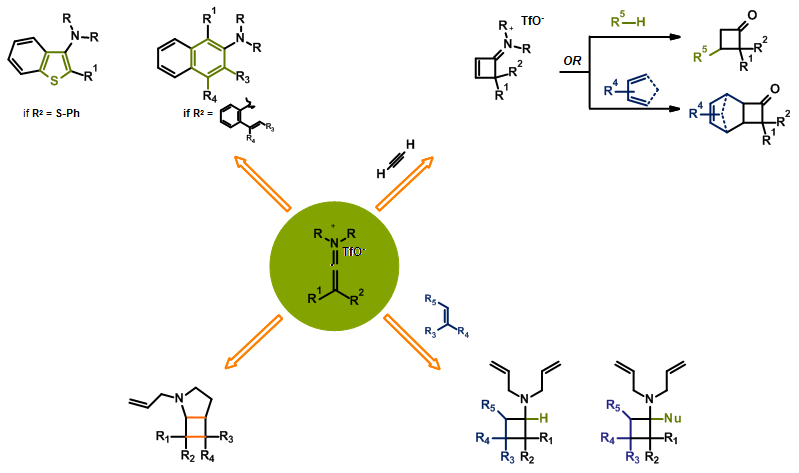 Keteniminium salts possess different types of reactivities enabling the formation of versatile valuable skeletons. Highly substituted naphthylamines as well as 3-amino-benzothiophenes are indeed easily accessible and involve keteniminium salt intermediates reacting via a 6π-/10π or a 6π-electrocyclization respectively. But among all the reactions involving keteniminium salts, [2+2] cycloadditions have been by far the most studied; we recently developed a [2+2] cycloaddition with alkynes affording cyclobuteniminium salt adducts which were further elaborated by [4+2] cycloaddition or Michael addition reactions using various dienes or nucleophiles. Furthermore, we also reported a one-pot sequence to obtain aminocyclobutanes, relying on [2+2] cycloadditions with alkenes followed either by stereoselective reduction or nucleophilic addition. The use of easily removable N-allyl protecting groups increases the potential of this method to access, in a few steps, highly functionalized cyclobutaneamines-containing building blocks.