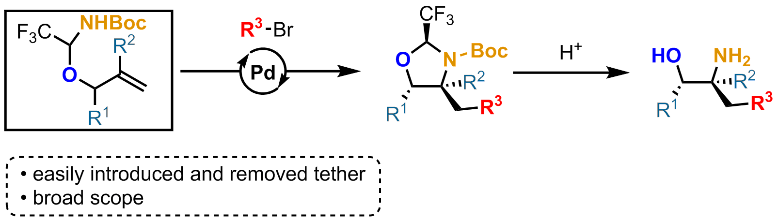 Vicinal amino-alcohols are a common structural motif that can be found in a wide array of biologically active natural compounds, ligands, catalysts and chiral auxiliaries.[1] Therefore, efficient methods for their synthesis are necessary. The use of removable tethers combined with Pd-catalyzed olefin functionalization has known intense developments in recent years and has proved to be an efficient strategy for the installation of new functionalities on an alkene in a 1,2 relationship.[2] Recently, our group has introduced (hemi)aminal tethers derived from trifluoroacetaldehyde for the carboetherification and carboamination of allylic amines to give aminoalcohols and diamines.[3] Herein, we would like to report the successful implementation of this strategy to allylic alcohols. The synthesis of a stable hemiaminal could be achieved, followed by a Pd-catalyzed carboamination that could install concomitantly a C-N bond and a highly valuable C-C bond.[4] A wide variety of groups could be introduced to form functionalized oxazolidines that could then deliver the free amino alcohols under acidic hydrolysis.