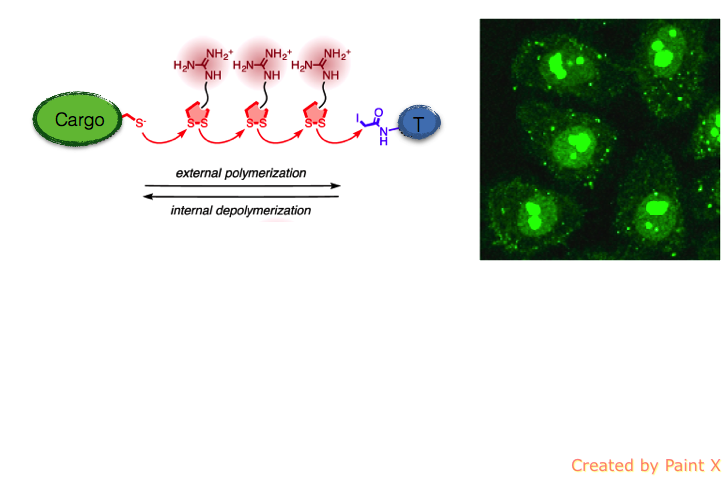 Substrate-initiated cell-penetrating poly(disulfide)s (si-CPDs) are emerging as innovative molecular transporters due to their ability to deliver cargoes without cytotoxicity, through a proposed novel counterion thiol-mediated uptake mechanism [1]. Inspired by surface-initiated polymerization, we developed a conceptually new approach to grow CPDs on a variety of substrates through ring-opening disulfide exchange polymerization, in solution and under mild conditions. Thiolated fluorescent probes are commonly used as initiators, cyclic disulfides as monomers and iodoacetamides are used as terminators. Like cell-penetrating peptides (CPPs), CPDs are enriched with guanidinium groups which help the delivery of the cargo through the formation of micellar pores in the membrane. However, CPDs also contain a poly(disulfide) backbone which, through dynamic covalent disulfide-exchange, helps to increase uptake and, most importantly, eliminates the cytotoxicity which is common to many CPPs. Due to this dual uptake mechanism, our best performing CPDs were able to reach the nucleus of HeLa cells in 15 minutes and at nM concentration. Once internalized, the poly(disulfide)s are readily depolymerized thanks to the high concentration of glutathione in the cytosol. Recently, CPDs were used to achieve protein delivery through biotin-streptavidin technology [2], leading to the development of a general method to deliver other types of cargoes such as monobodies. CPD sidechain functionalization [3] is used to introduce more solubilizing groups such as sugars is currently undergoing to prevent aggregation during protein delivery.