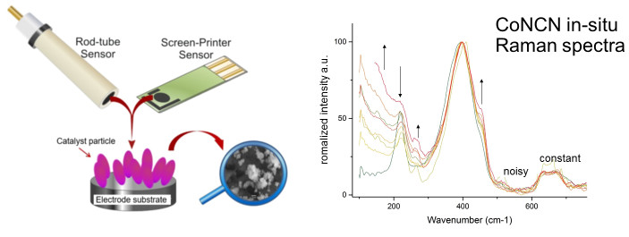 Raman spectroscopy was chosen in the first place as a surface sensitive technique to probe for different catalytic sites and temporary changes upon electrode polarization. The oxygen free MNCN type catalysts were deposited on versatile screen printed electrodes which offered a unique platform to study the heterogeneous electrocatalytic mechanism of water oxidation. Surface confined catalyst-oxygen interactions can be studied without the background signal of bulk material oxygen atoms. Results so far indicate no formation of such layers, and the applied setup is subject to further optimization for lowering the detection limits.