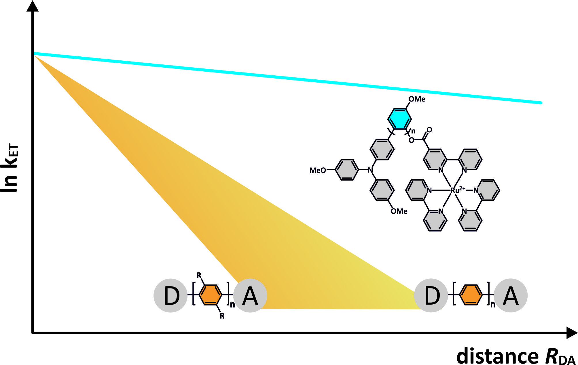 Comparison of electron transfer rates (kET) vs. donor-acceptor-distances (RDA) in para-phenylenes, para-xylenes, and oligo-ortho-phenylenes.