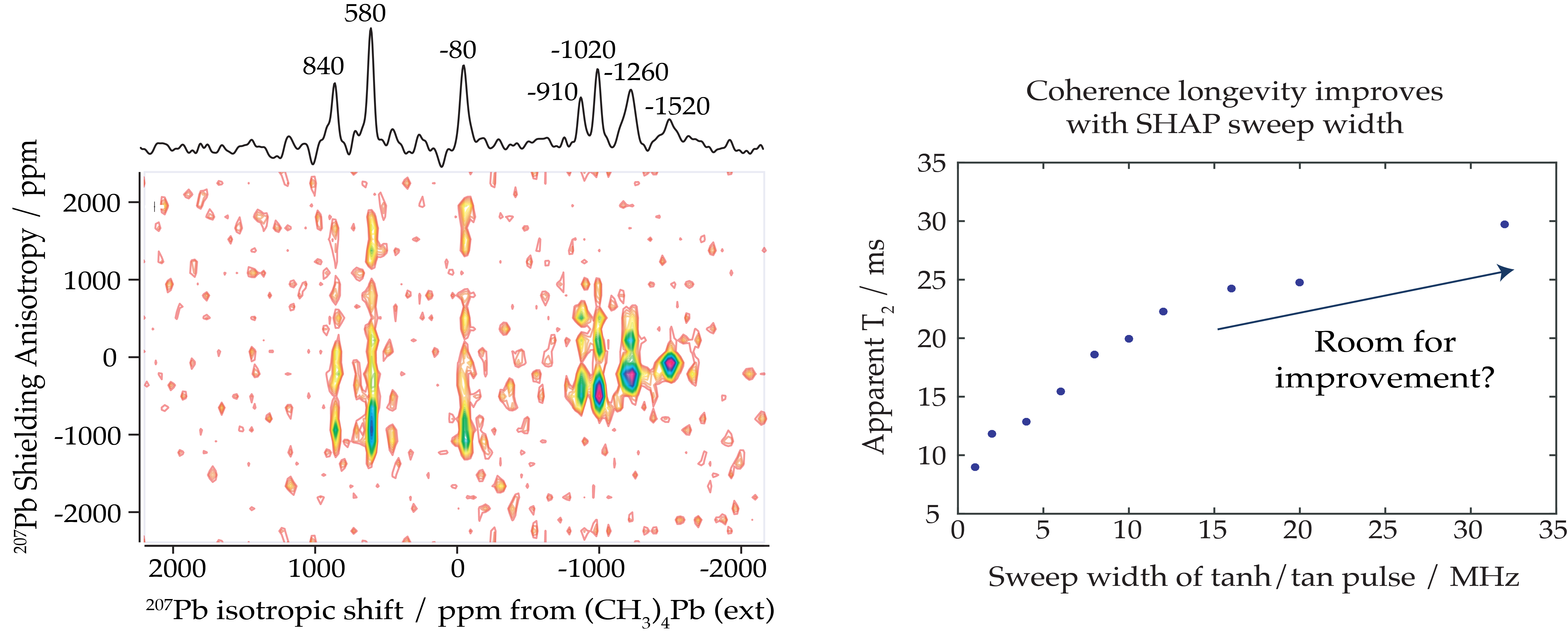 Using short, high-power adiabatic pulses (SHAP) [4] in combination with state-of-the-art NMR pulse sequences [5, 6] we investigate changes in the chemical shift anisotropy (CSA) parameters and spin relaxation behaviour at 207Pb sites in three ferroelectric materials: PbTiO3, Pb5Ge3O11 and PMN-PT. We observe the first site resolved spectra of Pb5Ge3O11 and we measure a T2' for PbTiO3 that is one order of magnitude longer than previously reported [7]. We present variable temperature 207Pb NMR data and discuss how changes in the NMR spectra relate to changes in the local and bulk structure of these materials.
