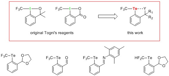 Hypervalent iodine (III) reagents are electrophilic trifluoromethylating agents commonly applied in organic syntheses. Since their introduction in 2006,[1,2] the parent structures have been subjected to numerous modifications. However to date, the central iodine atom has been retained in each instance.[3–5] Herein, we report for the first time a synthesis of unique compounds in which the iodine atom has formally been exchanged for tellurium. Thus, a series of CF3 tellurium (II) species differing in the functional group coordinated to the central atom has been obtained. All products have been fully characterized using HRMS and NMR spectroscopy, including advanced 1H125Te and 19F125Te correlation measurements. Furthermore, selected modifications performed after installing the CF3 group on the tellurium atom have been successfully carried out.[6]