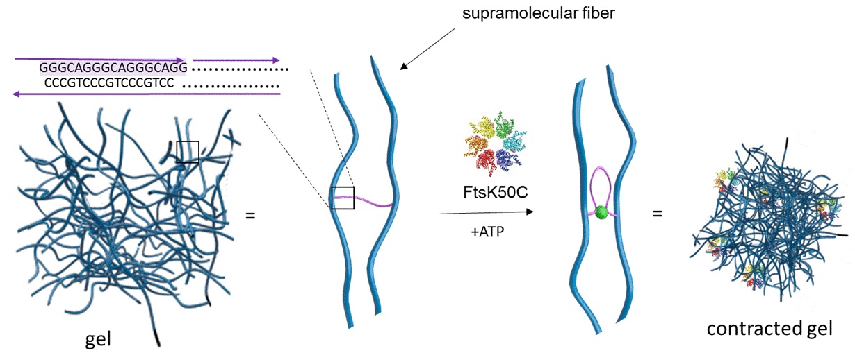Herein, we explore the possibility to transfer mechanochemical activity exerted by motor proteins to a synthetic hydrogel. Water-soluble supramolecular polymers are excellent candidates for this purpose, since they possess numerous properties intrinsic to extra- and intracellular matrices – biocompatibility, tunable rheological properties, dynamic behavior of components, and adaptability to stimuli.[1] The model material in this study is a hybrid DNA hydrogel assembled from one-dimensional supramolecular polymers (structural scaffold), in which the filaments are held together by complementary DNA strands (crosslinking motifs). The supramolecular polymers consist of two kinds of co-assembled benzene-1,3,5-tricarboxamides, one of which is conjugated to a short DNA handle. The self-assembly exhibits two regimes of the supramolecular polymerization. Moreover, the usage of two components allows to adjust the dynamics and crosslinking density of the material. Based on the previous results, we foresee that such hydrogels can be rendered active, i.e. change their stiffness and exhibit spontaneous mechanical fluctuations in the presence of the DNA translocase motor protein and ATP.[2] We believe that our system can provide a convenient tool to establish design principles for the preparation of adaptive and responsible artificial soft matter. The project offers opportunities for studying the diverse properties of active materials which are difficult – if not impossible – to modulate in entirely natural objects.