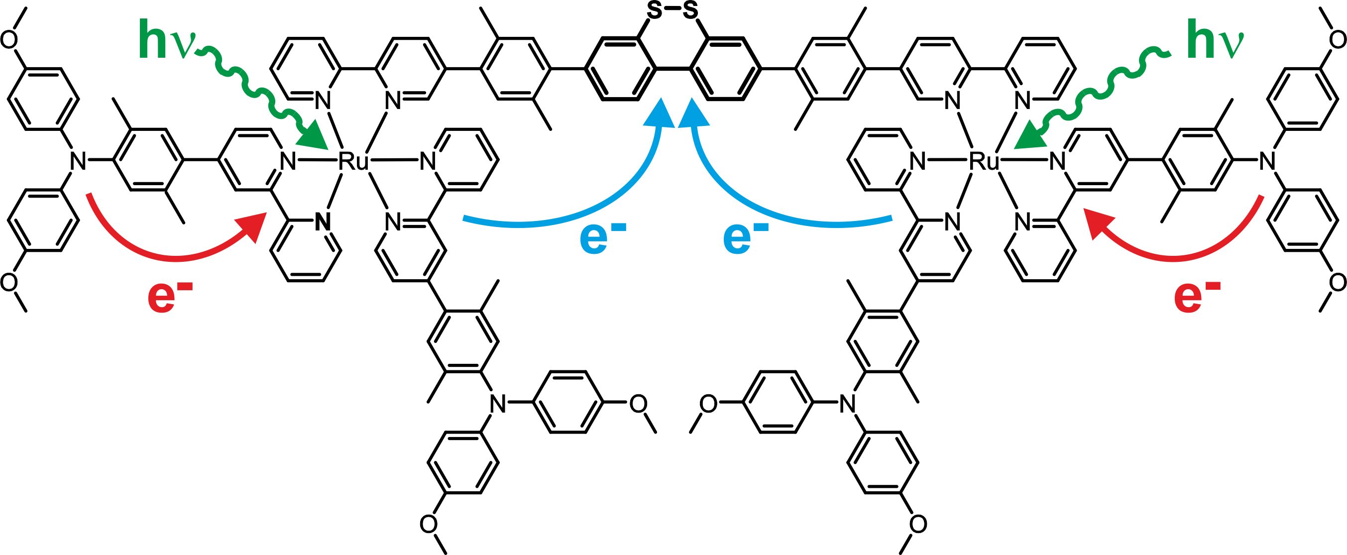 In this work, light-induced charge accumulation on dibenzo[1,2]dithiin was achieved in absence of sacrificial donors. We were able to show that after excitation of the sensitizers, the intramolecular two electron transfer from the triarylamine moieties to the dibenzo[1,2]dithiin unit indeed takes place. In presence of acid, a very long living dithiol species is formed.