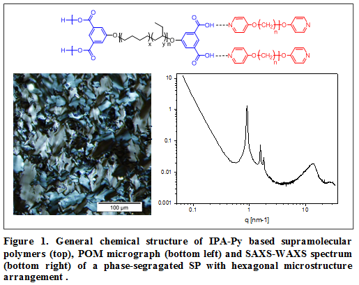 A new class of phase segregated SPs based on the isophthalic acid-pyridine (IPA-Py) H-bonding motif was recently reported.2 These SPs are synthesized by mixing two components, a telechelic poly(ethylene-co-butylene) terminated with isophthalic acid units and a bipyridine (Figure 1). In these SPs, the hard phase is formed by the crystallization of the IPA-Py motifs, and the properties of the hard phase can be controlled by simple variation of the bipyridine component. In this contribution we report the results of an experimental study in which the influence of the hard phase’s composition on the microstructure of IPA-Py-based SPs was explored. Through the combination of small angle X-ray scattering (SAXS), electron microscopy (TEM), thermal and thermomechanical analyses, we discovered that very subtle changes in the hard phase composition can cause considerable changes of the SPs’ morphology. Temperature-dependent SAXS studies revealed that most of these SPs feature a hexagonal microstructure arrangement above the melting temperature of the hard phase. However, when cooled from the melt, the observed mesophase is either retained or lost, depending on the nature of the bipyridine component. The results show strikingly that the crystalline structure of the hard phase has a strong influence on the phase behaviour of nanophase-segregated SPs.