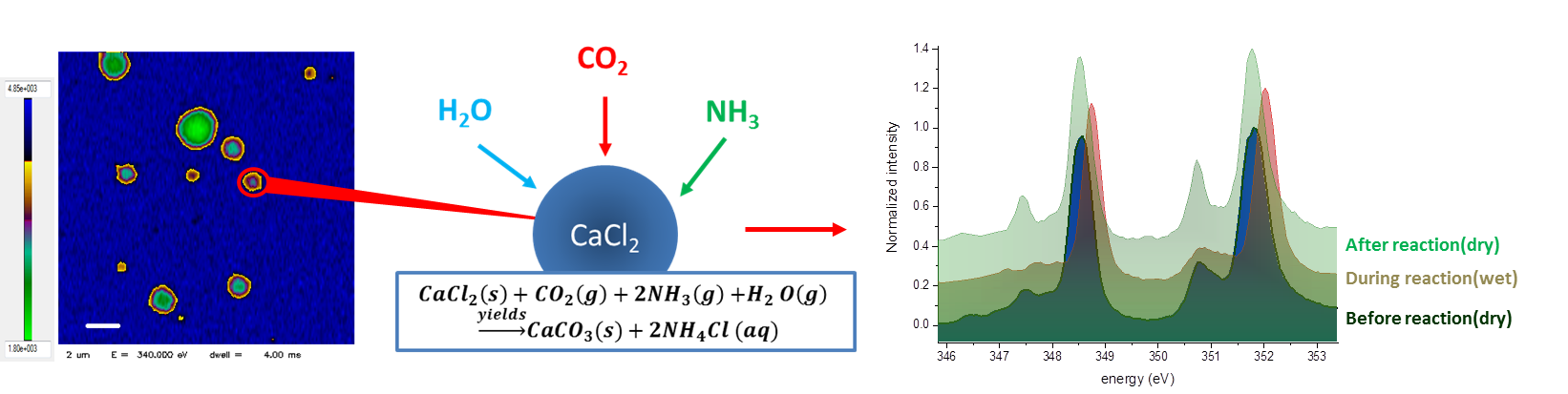 By utilizing a well-designed in-situ cell for probing microdroplets, the early stages of nucleation of calcium carbonate and subsequent dehydration of ACC were studied through the diffusion controlled reaction of calcium chloride with gas phase water, carbon dioxide and ammonia[3]. The structural changes occurring during the reaction were monitored in-situ using synchrotron based STXM (scanning transmission X-ray microscopy) and infrared spectroscopy. The results obtained confirmed the formation of ACC[4] as an intermediate step and further structural changes were observed in the formed ACC during dehydration under different relative humidity conditions.