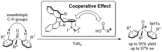Chang et al. reported an Ir(III) catalyzed amidation of arylphosphine oxides that proceeds in modest enantioselectivities.[3] We report that our recently developed chiral CpXIr(III) complex,[4] in combination with a chiral carboxylic acid, provides a highly selective C-H amidation process. A very strong cooperative effect between the chiral CpXIr(III) complex and the carboxylic acid was discovered. This proved to be pivotal for high enantioselectivities and yields.