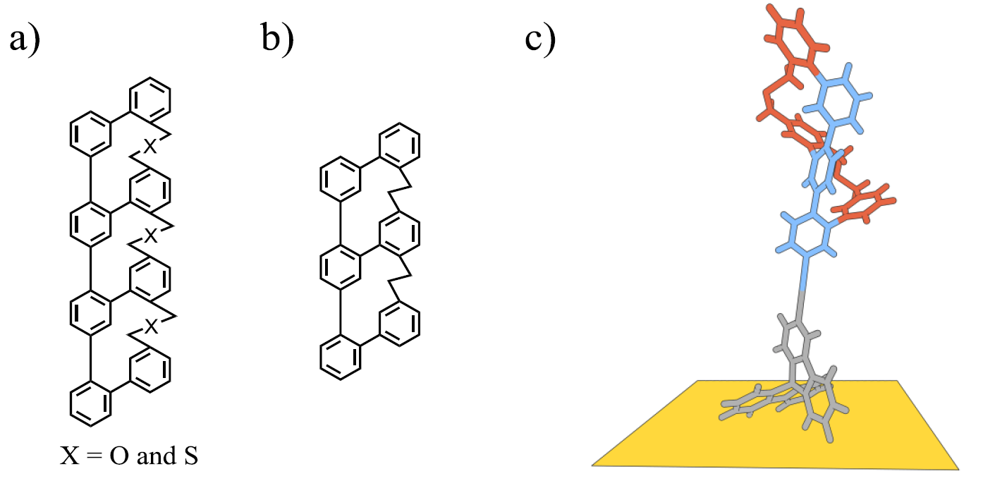 Figure 1: Three novel systems to investigate properties of chiral polycyclic aromatic compounds. a) Design of the higher-order oligomer species. b) Helical Geländer system containing only hydrogen and carbon atoms. c) 3D illustration of the immobilized Geländer molecule on a metal surface.