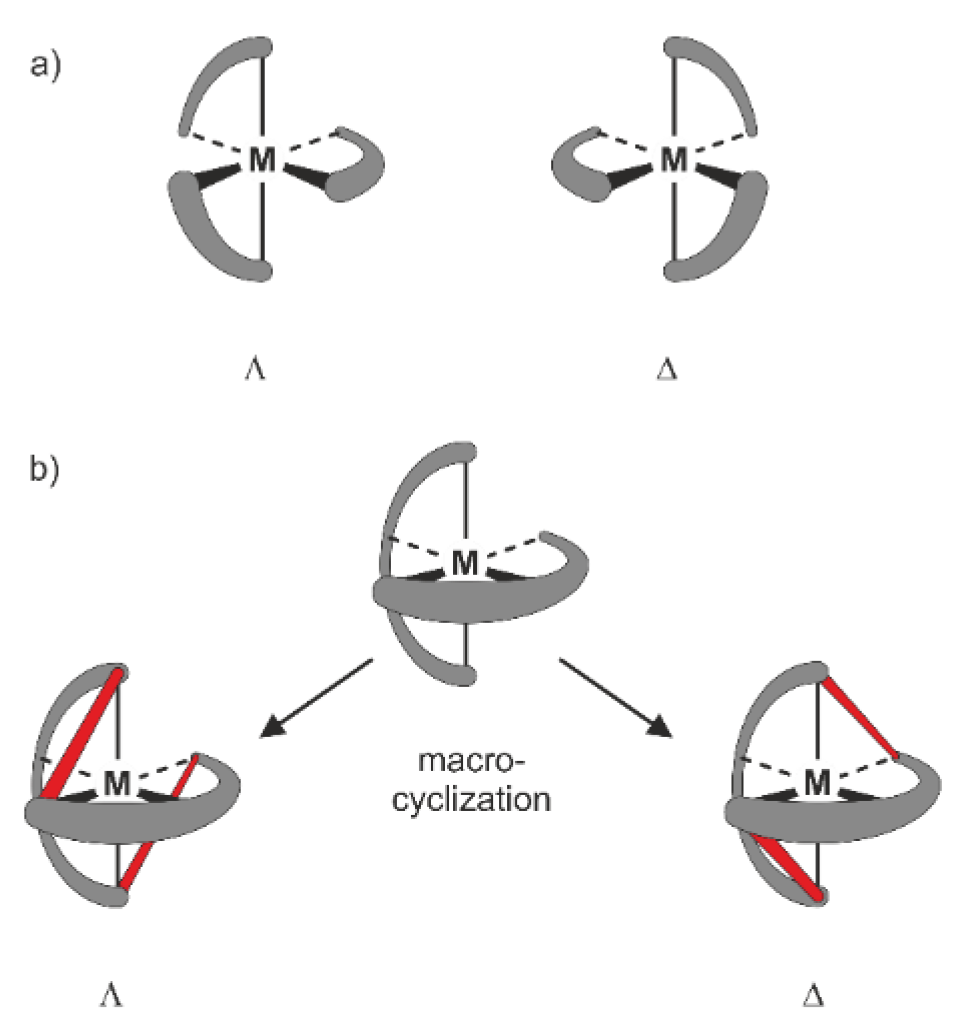 Figure 1: Sketch of axial chirality in metal complexes: a) axial chirality with bidental ligands (e.g. 2,2’-bipyridine). b) Concept of introducing chirality by macrocyclization. Top: Achiral complex of a tridental ligand (e.g. 2,2':6',2''-terpyridine). Bottom: Axial chiral metal complexes obtained by interlinking the ends of the two tridental ligands (interlinking bridges in red).