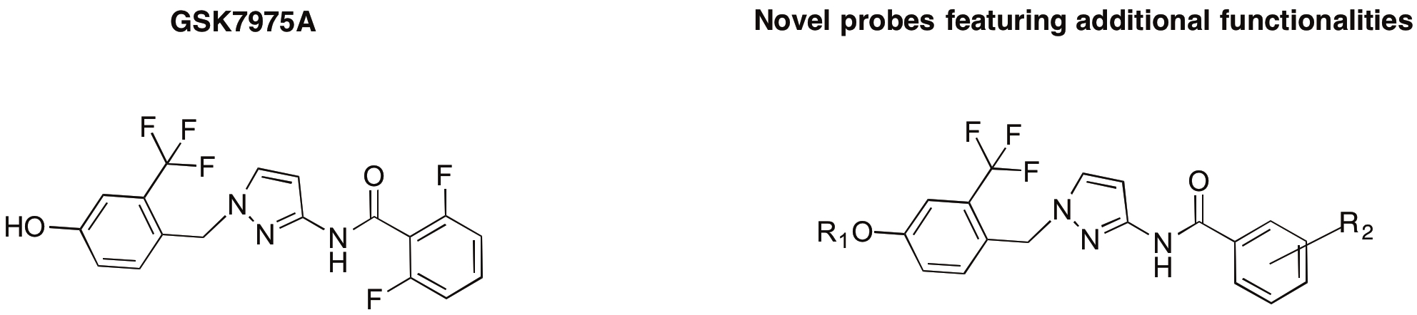 To provide a better understanding of the process of SOCE and the proteins involved (i.e. Orai, STIM), we synthesized novel probes based on the known SOCE-inhibitor GSK7975A. This class of inhibitors feature two functionalities: a photo-crosslinking moiety for covalent target modification as well as a handle for bioorthogonal chemical modifications. Herein, we present the synthesis of these novel probes and their preliminary biological assessment.
