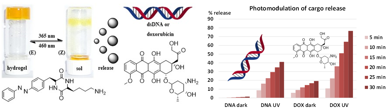 Recently we have reported [1] photoresponsive supramolecular hydrogels based on an azobenzene-containing cyclic dipeptide (or 2,5-diketopiperazine; PAP-DKP-Lys), which is a low-MW hydrogelator. The gelation process can be triggered with temperature, pH, light, and ionic strength. The resulting gels exhibit excellent self-healing properties. In presence of DNA the compound forms hydrogels that release the oligonucleotides upon irradiation with 365 nm UV light. Hydrogels formed in presence of anticancer drug doxorubicin also release the cargo in a light-dependent manner.