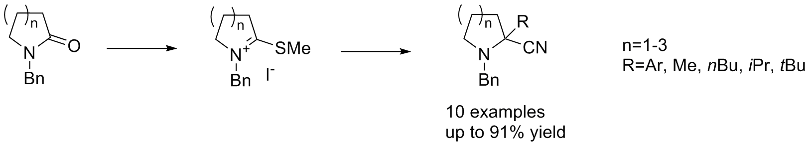 An efficient and robust route toward fully substitued cyclic α-aminonitriles via thioiminium ions obtained from cyclic lactams was recently developed in our group. Quaternary α-aminonitriles were obtained in good yields after sequential alkylation-cyanation process.[1]
