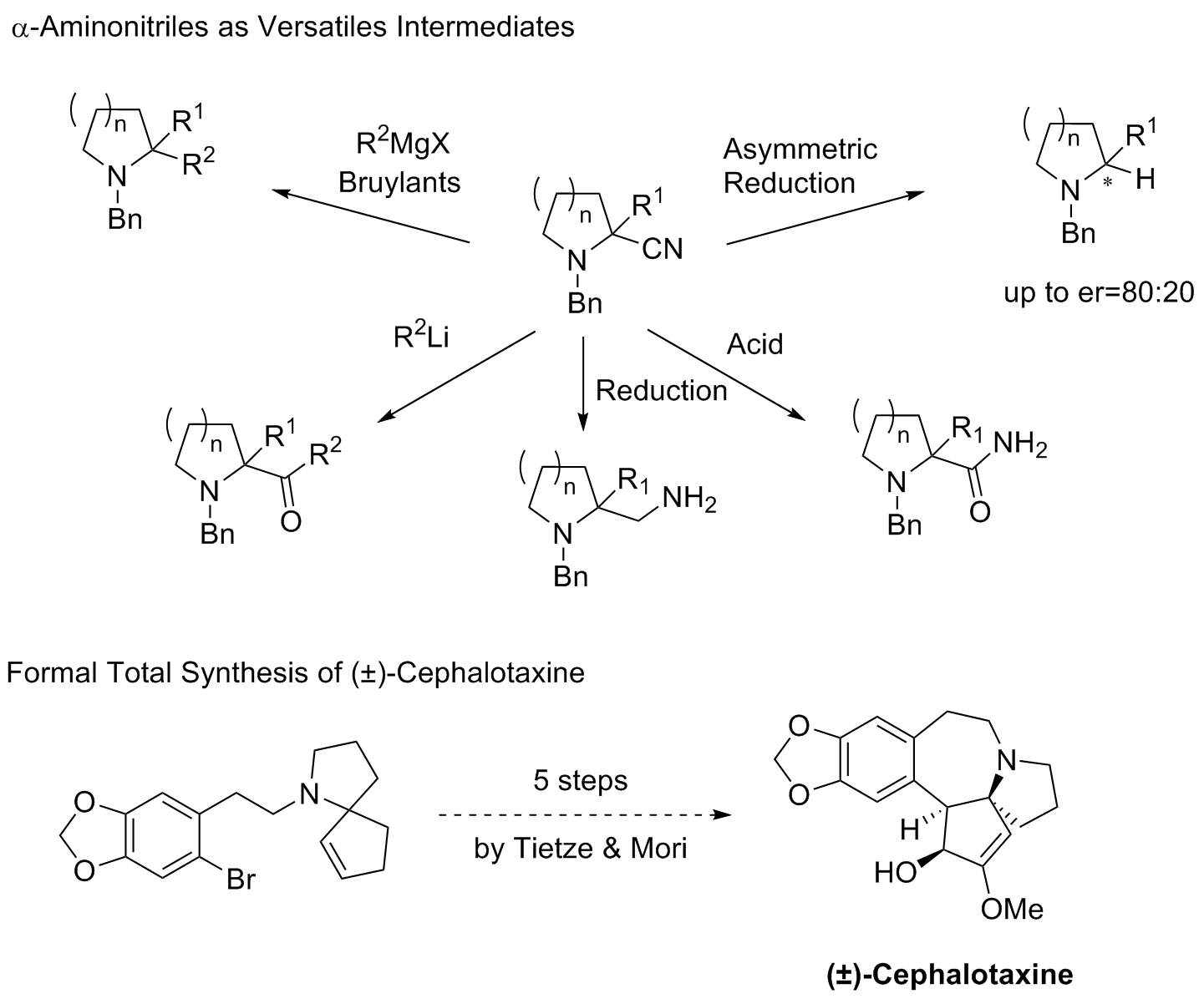 Nitrile groups are interesting moieties since they can be converted in one step into a variety of other functional groups, including primary amines, ketones, carboxylic acids (or esters), and amides. They are also stable precursors of iminium ions and enamines. Our work focused on the use of those later versatile intermediates and especially their asymmetric reduction.[2] The results are presented herein. This strategy was successfully applied in the formal total synthesis of (±)-Cephalotaxine via the preparation of Tietze' s intermediate.[3]