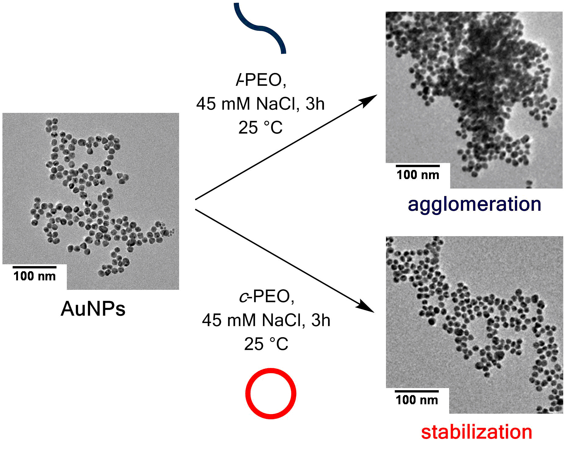 Metal nanoparticles exhibit an array of properties which have enabled their use in various scientific disciplines. However, the preservation of the nanoparticle stability towards agglomeration or dissolution remains a major drawback since those phenomena alter the size- and shape-dependent properties of the nanostructures. The key to the enhancement of the stability is the tuning of the surface properties of the nanoparticles, and various approaches have already been conducted in order to achieve this goal. For instance, the surface of metal nanoparticles has already been functionalized with various inorganic, organic or hybrid inorganic-organic shells in order to tailor them for their specific target applications. This strategy enabled the preparation of non-conducting metal nanoparticles suitable as dielectric materials [1] or core-shell particles rendered hydrophobic through surface-initiated radical polymerization beneficial for their dispersion in different organic solvents [2]. Although a variety of polymers have already been grown or attached onto the nanoparticle surface or have simply been applied as additional stabilizer into the colloidal dispersion, the effect of the polymer topology on the enhancement of the nanoparticle stability has not yet been subjected to thorough investigation. Previous work featured that micelles composed of cyclic ABA triblock copolymers exhibit enhanced stabilities towards salt-induced agglomeration compared to the micelles of their corresponding linear counterparts.[3] Hence, a key highlight of this work features the synthesis and stabilization of metal nanoparticles (gold and silver) by polyethylene oxide (PEO) where substantial changes in the average nanoparticle size and stability under saline conditions were observed through the variation of the polymer topology. Overall, the average particle size of the metal nanoparticles is reduced in the presence of cyclic PEO (c-PEO) and the resistance of the nanoparticles towards agglomeration is extended over a larger concentration of NaCl (≤ 180 mM) which is in direct contrast to the nanoparticles stabilized by linear PEO (l-PEO) where agglomeration occurs at NaCl concentrations as low as 45 mM.