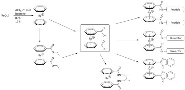 This work focuses on an improved synthetic pathway to [Re(η6-C6H5COOH)2]+. Beside the high chemical stability of these complexes and its inertness towards oxidation and hydrolysis, the carboxylic groups represent a core feature for derivatisations with targeting moieties via amid bond formation. Amino acids, peptides or other biomolecules can conveniently be introduced along this approach.