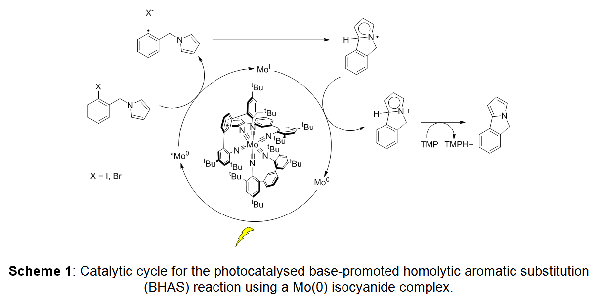 We present the photophysical properties of this Mo(0) complex and demonstrate its application in photoredox catalysis. A specific example is the photocatalytic base-promoted homolytic aromatic substitution (BHAS) reaction shown in Scheme 1.