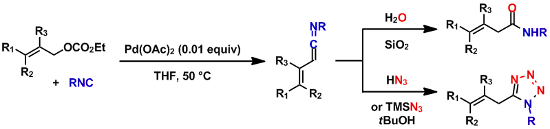 The reaction of allyl ethyl carbonates with isocyanides in the presence of a catalytic amount of Pd(OAc)2 provided ketenimines through β-hydride elimination of the allyl imidoylpalladium intermediates. The insertion of the isocyanide into the π-allyl Pd complex proceeded via an unusual η1-allyl Pd species. The resulting ketenimines were hydrolyzed to β,γ-unsaturated carboxamides during purification by flash column chromatography on silica gel or converted in situ into 1,5-disubstituted tetrazoles by [3+2] cycloaddition with hydrazoic acid or trimethylsilyl azide.