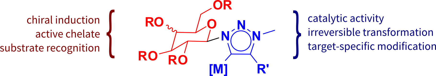 N-Heterocyclic carbenes (NHC) have been demonstrated to be very versatile ligands in various catalytic systems[1]. We have shown the promise of 1,2,3-triazolylidines as a class of NHC with broad applications for materials science and biochemistry[2] in addition to catalysis. Facile preparation through Cu(I)-catalysed CuAAC ‘click’ chemistry, and subsequent alkylation, makes these ligands very attractive. Here we report transition metal–NHC complexes with incorporated carbohydrate functionality in the ligand structure (see general structure in Figure 1).