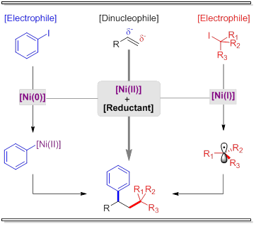 Addition of two hydrocarbon derivatives across π-systems has been traditionally carried out using formally a nucleophile and an electrophile as reaction partners[1]. The multiple bond is thus conceptually considered as a (+/-)-dipole, which justifies the extensive use of electronic biased substrates.[2] Alkylative procedures that can be applied to a wide range of substrates independently of their intrinsic nature are still in high demand. Here, we present the first example of an intermolecular, three-component reductive dicarbofunctionalization of olefins with aryl iodides and alkyl iodides as reaction partners.[3] In contrast to previous methods[4], the reaction tolerates a wide range of olefins and the carbon sources do not require any additional functionalization. Interestingly, this process is characterized by the present of two different nickel cycles interconnected by the action of both, the unsaturated partner and the reductant.