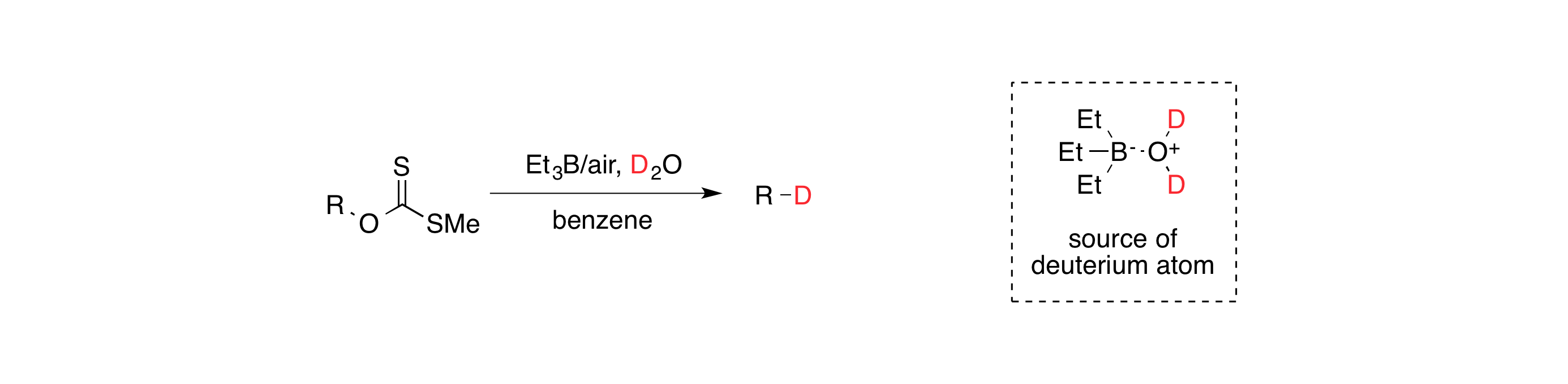 The development of the deuteration method led us to discoveries that incite us to reinvestigate the mechanism of xanthates deoxygenation described by Wood et al.5 (see below) who used heavy water activated by trialkylboranes as a source of deuterium atom.
