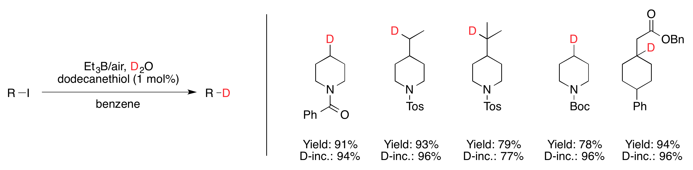 We report here a method to deuterate alkyl iodides via a radical pathway with deuterated water as source of deuterium atom. Triethylborane is used to initiate and propagate the chain and dodecanethiol is used as a catalyst4. High deuterations and yields are obtained using this method which is compatible with a large range of functional groups.