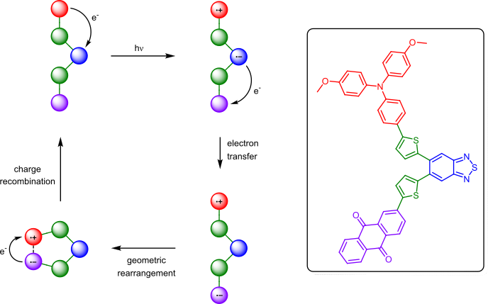 This presentation shall cover the design principles and spectroscopic characterisation of an electron donor-acceptor-acceptor (D-A-A) triad as a proof-of-concept photoinitiated molecular circuit (Figure 1), with a conservatively estimated quantum efficiency of 7.8%. This is achieved through three sequential charge-transfer processes, and the exploitation of geometric rearrangement in the excited state.
