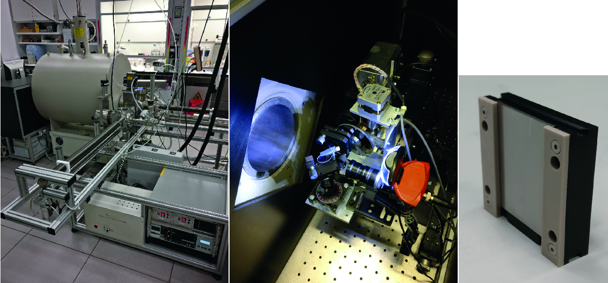Figure 1: From left to right: ultrahigh vacuum interlock system with 4.7 T superconducting magnet; Nd:YLF laser (349 nm) setup with attenuator and camera on a 2D translation stage; target plate holder fitted with a 30.0 × 40.0 × 1.00 mm target plate (grounded with spring contacts on the back).