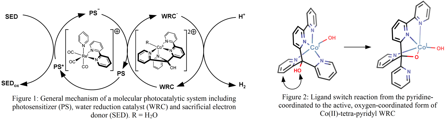 The catalytic properties of Co(II)-tetra-pyridyl (CoTPY) complexes for hydrogen production have been examined for a long time. Despite the fact that more effective WRCs are known, CoTPY and its derivatives offer ideal subjects to study mechanistic aspects of water reduction. The understanding of this 2-electron-2-proton transfer is of crucial importance to improve catalytic systems in terms of efficiency and stability and finally to drive photo catalysis towards being a sustainably applicable energy source.