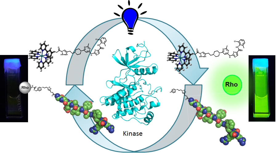 Fig1. Cartoon of fluorophore release through the reaction templated by Abl kinase (PDB: 2GQG)
