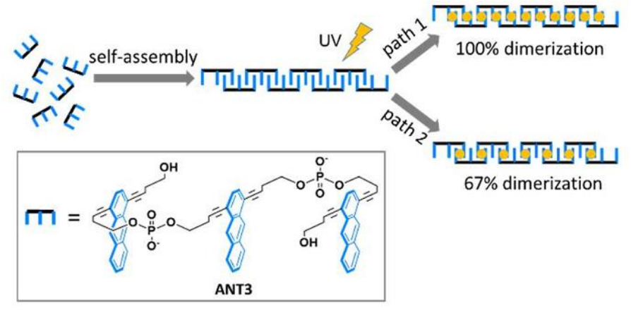 Dimers and trimers containing different isomers of anthracene were successfully synthesized through automated solid-phase synthesis and phosphoramidite chemistry. These oligomers displayed a self-assembly behavior in water, giving rise to supramolecular polymers. Atomic Force Microscopy revealed that these polymers are nanofibers, with lengths of several micrometers. One of the dimers showed a peculiar temperature-dependent spectroscopic behavior. [4+4]-cycloadditions between anthracenes did not result in a change of shape for one of the trimers, but a dimer changed dramatically, and this could give us better understanding of the self-assembly behavior of these oligomers.