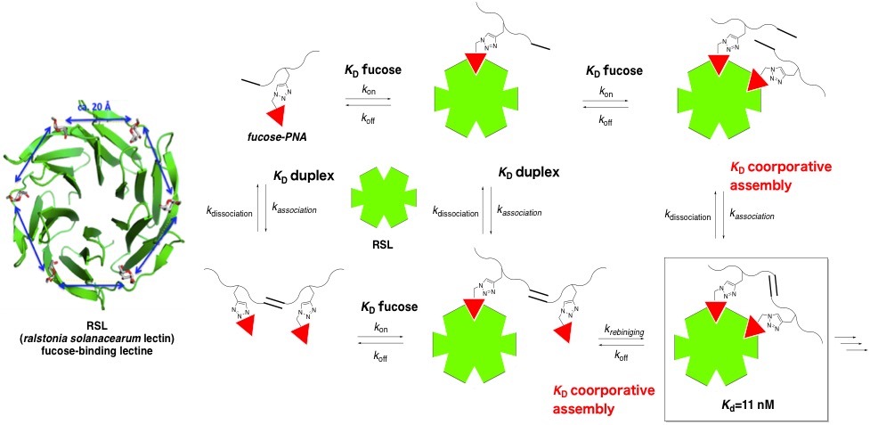 RSL was successfully blocked by conjugate with fucose and short peptide nucleic acid (PNA) with palindromic sequence (KD=11 nM) in which neither fucose nor PNA had comparable affinity (fucose: KD=2200 nM. PNA: GGCC, self hybridization KD=3800 nM). That suggested that host protein stabilize beneficial dimer formation. This conjugate had IC50 of 555 nM to inhibit the binding of fucose-binding lectin BambL to epithelial cells with efficiency of more than 700-hold compared to L-fucose.
