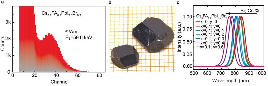 Figure 1. Energy resolved spectrum of an 241Am source using perovskite SCs; (b) A photograph of typical 0.5-1 cm CsxFA1-xPbI3-yBry SCs on a millimetre-grid paper; (c) Photoluminescence spectra of ground SCs.
