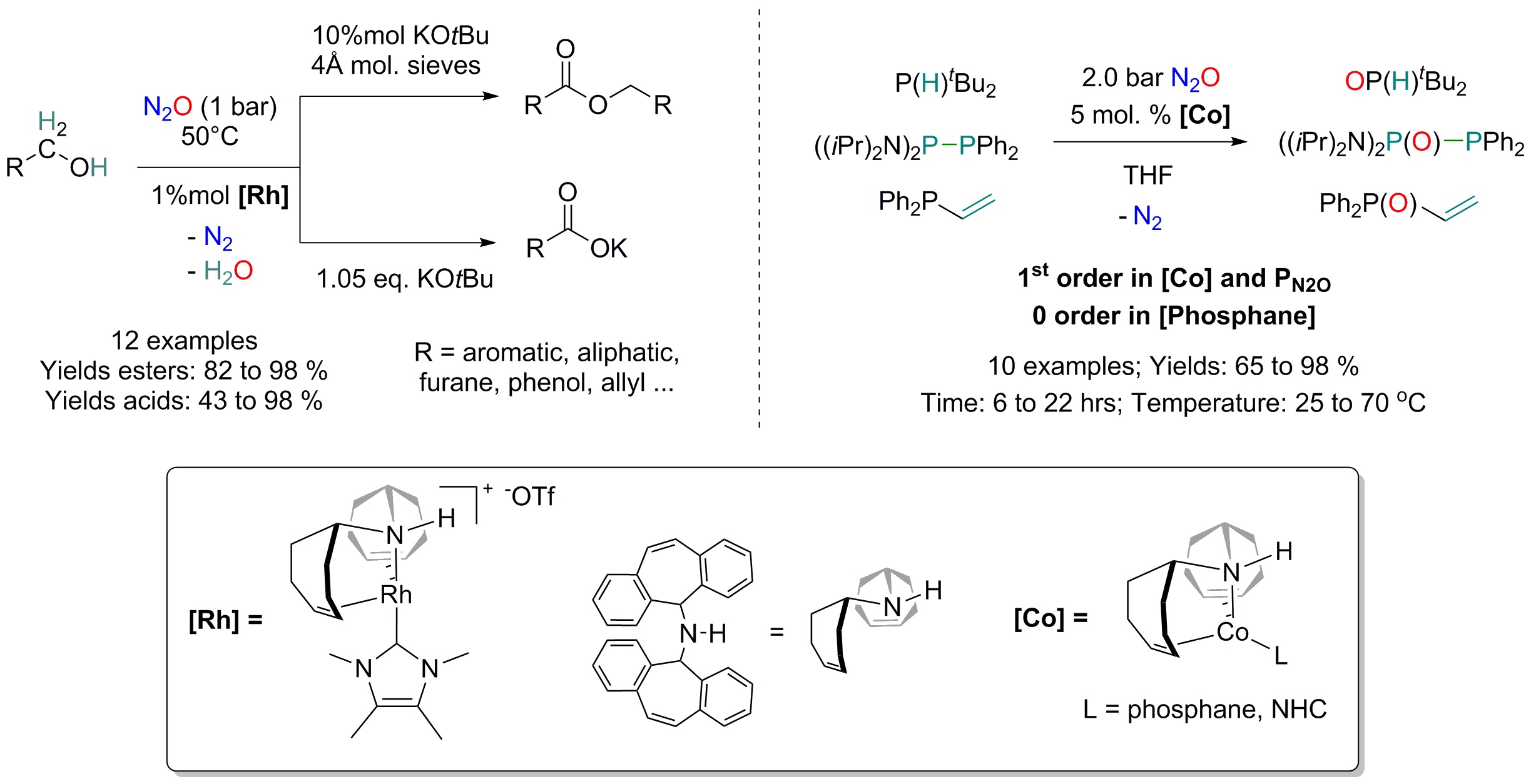 Nitrous oxide (N2O) gases have been recently identified as the largest global ozone depleting agents and as the 3rd largest emitted greenhouse gases worldwide and 300 times more powerful than CO2.[1] N2O is naturally produced via nitrification and denitrification of nitrate during nitrogen cycle, but is also an industrial waste. N2O emission has increased significantly during industrialization as a result of agricultural soil management, N-fertilizer use, livestock waste management, mobile & stationary fossil fuel, combustion and industrial processes. Its transformation to less harmful chemicals is of particular interest but very challenging, since even if thermodynamically unstable, nitrous oxide is kinetically inert.[2] We have successfully design low valent and reactive organometallic species containing group 9 metals (Rh[3] and Co[4]) that activate and catalytically transform, under mild conditions, this environmentally unfriendly molecules to valuable chemicals.