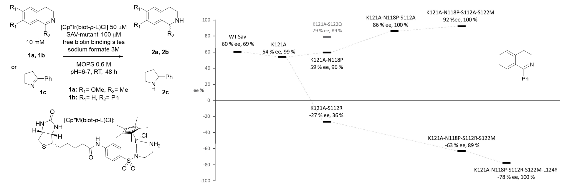 This simplified process significantly speeds up the screening protocol and allows for the identification of improved Sav mutants for ATHase of cyclic imines. Guided by the protein crystal structure, we have performed four rounds of mutation and selection. As a result, two Sav isoforms with improved activities and yielding opposite enantiomers in the reduction of 1-phenyl-3,4-dihydroisoquinoline were obtained. X-ray analysis confirmed the presence of introduced mutations, namely K121A-N118P-S112A-S122M (96 % ee, full conversion) and K121A-N118P-S112R-S122M-L124Y (-82 % ee, full conversion). These mutants also show improved reaction rates in comparison with the use of Sav wild type.