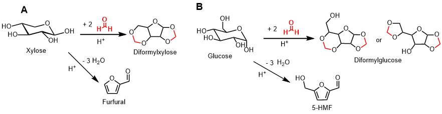 Figure 1. (A) Xylose conversion to diformylxylose and furfural (B) Glucose conversion to diformylglucose isomers and 5-hydroxymethylfurfural (5-HMF).