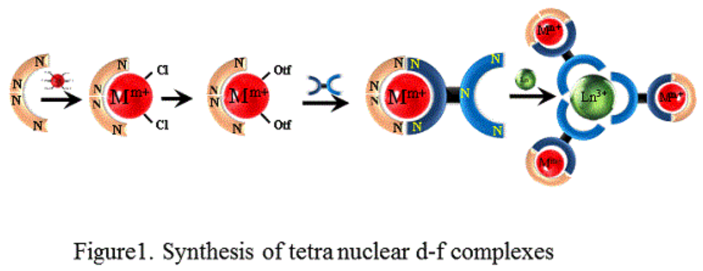 Ditopic ligands have been recently attracted much attention since they open novel possibilities and perspective in coordination chemistry and material science [1]. Ditopic ligands containing two separate bidentate and tridentate binding units are well-suited because of their unique physicochemical properties [2]. In this study, new synthetic strategies have been exploited for the preparation of tetra nuclear complexes containing d and f block metal ions (Figure 1). The first synthetic step consists of the preparation of preorganized ditopic Janus-type ligands [3] followed by the coordination of transition metal ion with the bidentate site. Further reaction of the complex with labile nine-coordinated Ln(III) results in the formation of the targeted tetranuclear d-f complexes (Figure 1). In this contribution, chemical requirements and design favoring the formation of the tetranuclear d-f complex will be presented.