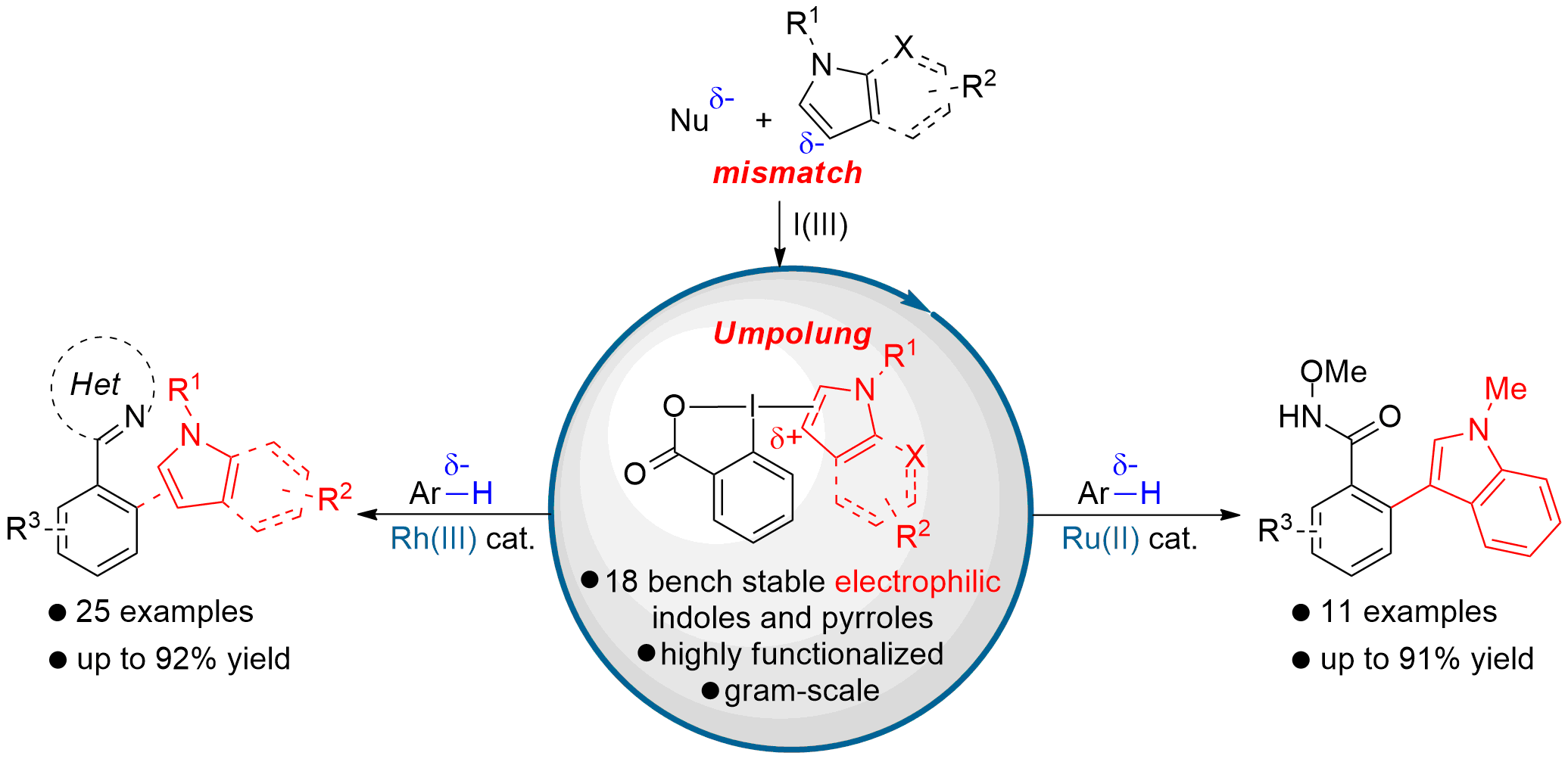 Amongst all the azoles present in nature, electron-rich pyrroles and indoles are the most ubiquitous.[1] Their application as pharmaceuticals, fragrances and agrochemicals, as well as their relevance as natural bioactive compounds, led to the development of countless methods for both their synthesis[1] and functionalization.[2] While the nucleophilic properties of indoles and pyrroles have been intensively exploited, their “umpolung” into electrophilic synthons remained largely unexplored, although it would be of high interest for the development of new synthetic disconnections. Up to now, few groups reported the synthesis of unstable hypervalent indoles iodonium salts; however the number of applications was limited.[3] We present herein the first synthesis of 18 new bench stable electrophilic indole and pyrrole[4] benziodoxolone[5] reagents. Using these new reagents, rhodium(III) and ruthenium(II) catalyzed C-H “indolization” of nucleophilic arenes were developed to furnish the desired products with complete regioselectivity. The obtained functionalized indoles and pyrroles could not be synthesized using existing metal catalyzed C-H arylation processes and are expected to be useful intermediates for the synthesis of optoelectronical devices and bioactive compounds.