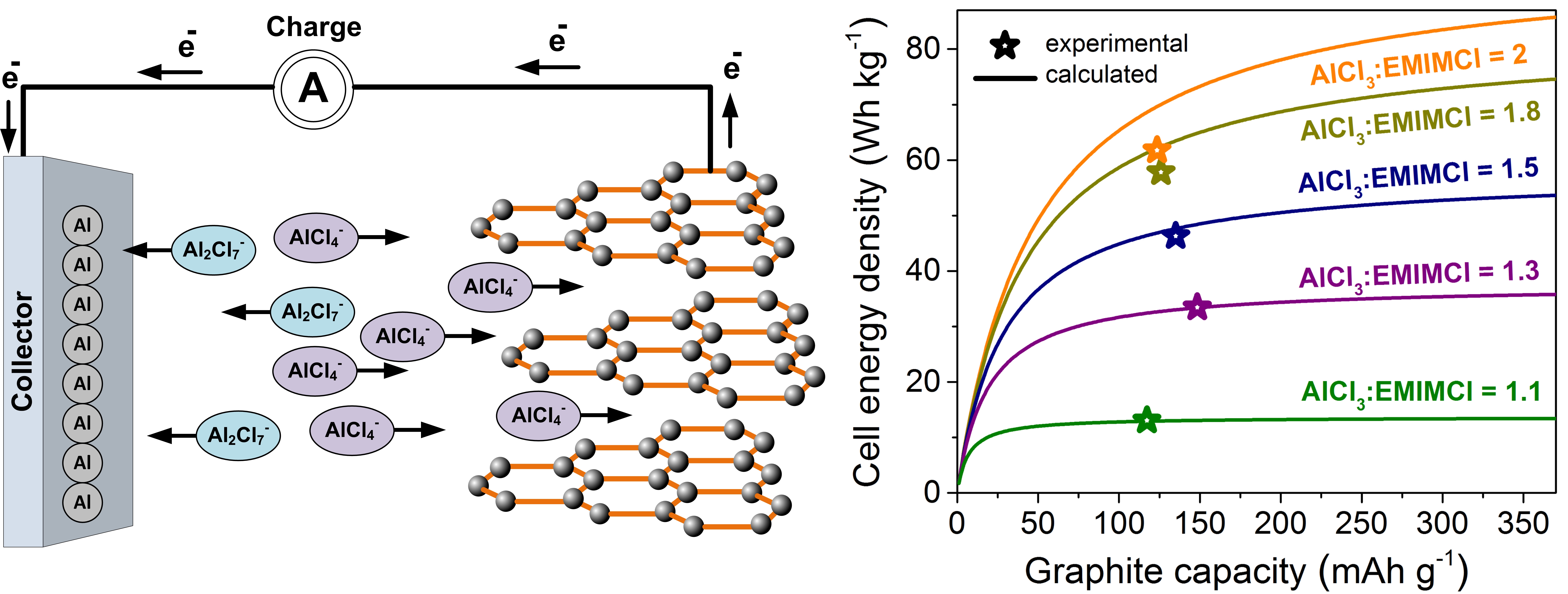 Non-aqueous, ionic liquid-based aluminum chloride-graphite batteries emerge as a highly promising post-Li-ion technology for low-cost and large-scale storage of electricity, because it features exclusively highly abundant chemical elements and simple fabrication methods. In this work, we examined the recently proposed aluminum–ionic liquid–graphite architecture.1 Although previous studies have focused on graphitic cathodes, we analyzed the practicality of achievable energy densities and found that the AlCl3-based ionic liquid is a capacity-limiting anode material. By focusing on both the graphitic cathode and the AlCl3-based anode, we improved the overall energy density.3,4 First, high cathodic capacities of ≤150 mAh g–1 and energy efficiencies of 90% at high electrode loadings of at least 10 mg cm–2 were obtained with highly crystalline natural graphite flakes or with synthetic kish graphite flakes, which were subjected to minimal mechanical processing. Second, the AlCl3 content in the ionic liquid was increased to its maximal value, which essentially doubled the energy density of the battery, resulting in a cell-level energy density of ≤65 Wh kg–1.