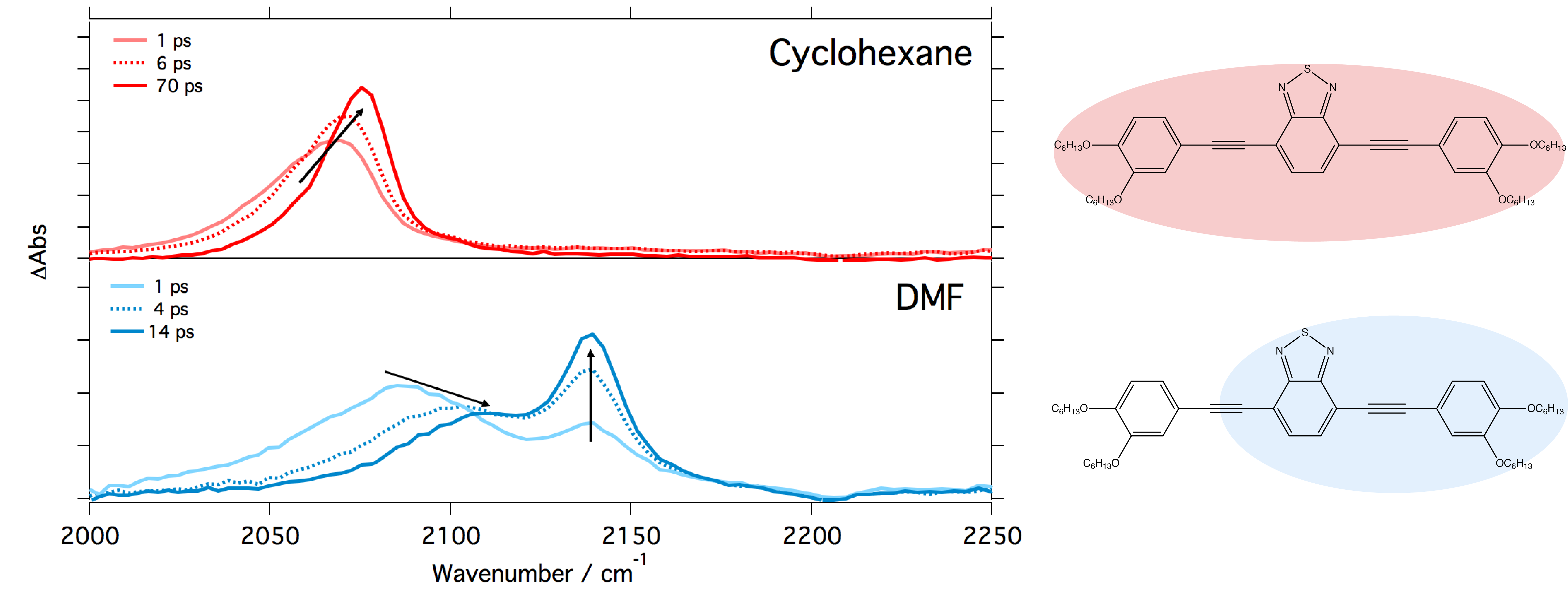 Quadrupolar molecules, comprising of D-π-A-π-D or A-π-D-π-A motifs, are mostly studied for to their strong two-photon absorption cross section. These compounds show almost no solvatochromism in their electronic absorption spectra but fluorescence reveals that the emitting state is greatly affected by the solvent. This phenomenon has been ascribed to excited-state symmetry breaking, i.e. to the unbalanced distribution of the excitation over the molecule due to fluctuations of the solvent or of the geometry of the molecule [1]. Whereas time-resolved electronic spectroscopic techniques do not provide much insight into the dynamics of the symmetry breaking of these compounds, time-resolved infrared spectroscopy constitutes an excellent tool to study this phenomenom. We are currently studying different quadrupolar compounds consisting of alkoxybenzenes as weakly donating groups and either benzothiadiazoles or anthracene moieties as central acceptors [2]. The D and A moieties are linked together with a carbon triple bond, which serves as an excellent IR active probe. We will discuss whether the solvation is the dominant factor determining the extent of symmetry breaking or whether conformational changes alone can induce symmetry breaking in these compounds.