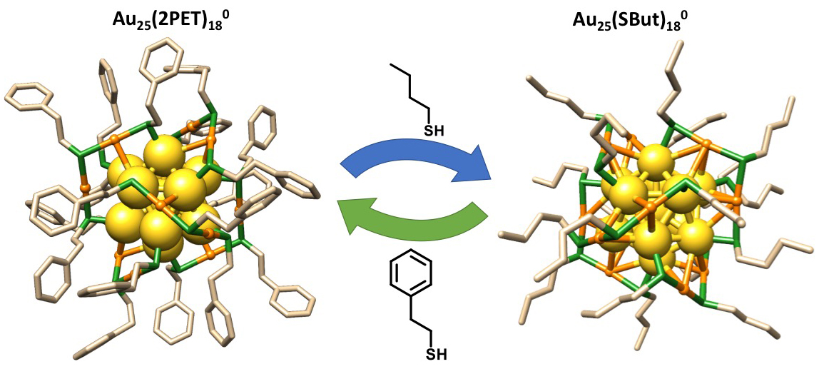 Small thiol protected gold nanoparticles (< 2nm), also known as gold cluster, are self-assembled systems formed by Au(0) core and a thiol protecting monolayer. The latter is fundamental not only for stabilization and solubility of the clusters themselves, but also is the principal responsible for their reactivity.[1] One of the most frequent reactions used to functionalized the monolayer are the thiol-exchange reactions.[2]. These reactions usually present difficulties in controlling the number of substitutions and the reaction time can vary from minutes to days. In this study we investigated the thiol-exchange reaction using nuclear magnetic resonance (NMR) spectroscopy and MALDI analysis.[3] Kinetic studies were performed on Au25(SC2H4Ph)18 exchange with butane thiol and vice versa (Au25(SButane)18 exchange with HSC2H4Ph, Figure 1). By these studies, were possible to understand: 1) the affinity of different thiol ligands towards the Au25 cluster, 2) calculating the number of thiols exchange, 3) the position of exchange and 4) obtaining the relative binding constants. From this information was possible to gain a clearer picture on the mechanism of this reaction that can help in fine-tuning the functionality of the monolayer.