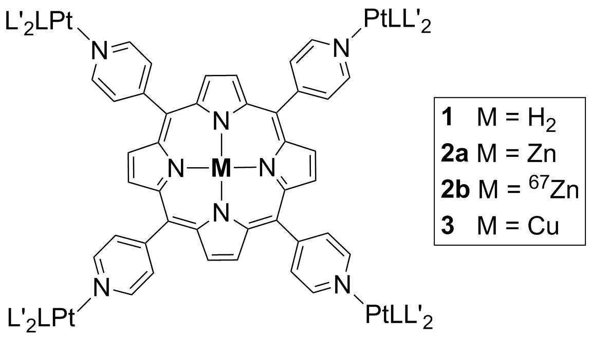 We have now started to study similar systems that contain a metal in the central position of the porphyrin (2 and 3). We will discuss the influence of the metal on the singlet oxygen yield, cellular dark and (photo)toxicity as well as cellular localisation. For the latter we employed the isotopically labelled 67Zn complex 2b in order to determine, by ICP-MS, the cellular distribution of 67Zn and platinum, which in turn allowed us to study the stability of the platinum - pyridine nitrogen bond within the cells. We included the copper(II) 3, since we previously discovered the first phototoxic copper(II) complex of a porphyrin.2