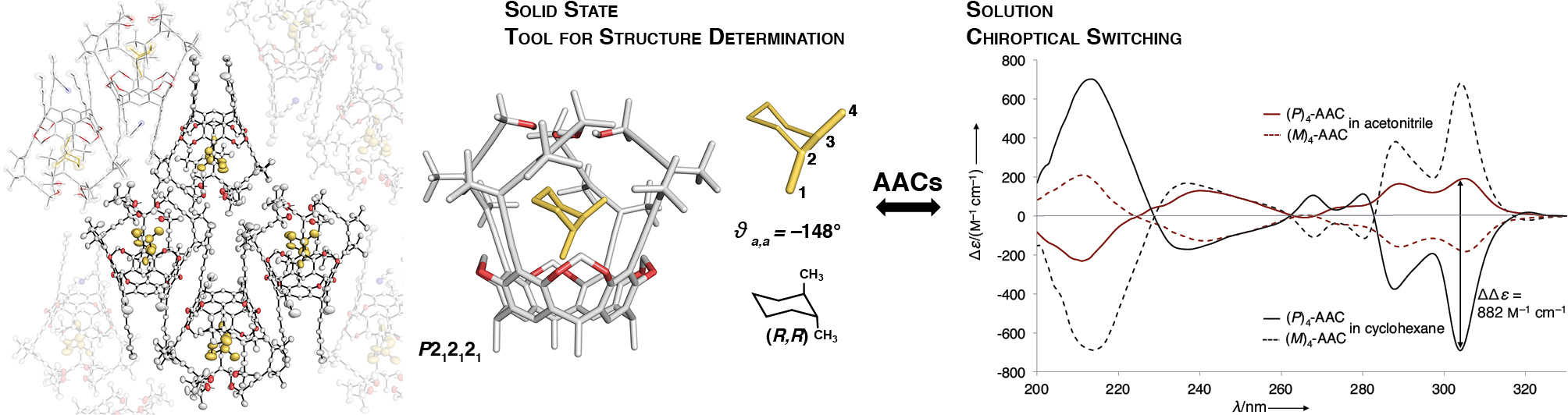 AACs assemble in the solid state to a porous network forming inclusion complexes with otherwise non-crystalline small molecules allowing for the first time the structural elucidation of 1,2-substituted cyclohexanes in their (di)axial conformation in the solid state. In combination with solution studies and computational studies this allows for the investigation and quantification of interaction and conformation at the molecular level [5].