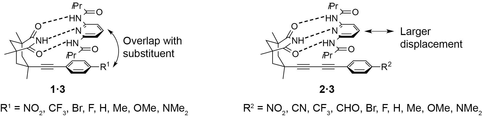 Guest 3 forms a triple H-bonding array to the imide moieties of receptors 1 or 2. This allows for a parallel stacking geometry between the pyridine ring in 3 and the aromatic platform of 1 or 2 at different displacement, as confirmed by comprehensive structural analysis in solution and in solid state. In complex 1·3, partial overlap between the pyridine core of 3 and the para-substituent R1 is generated by a short ethyne-1,2-diyl spacer and enables direct, through space interactions. Any substituent had a stabilizing effect on the stacking interaction, independent of its electronic nature. In complex 2·3, the elongated buta-1,3-diyne-1,4-diyl spacer prevents local, direct interactions between guest 3 and para-substituent R2. Here, the electronic influence of the substituent on the aromatic platform affected the stacking strength crucially.