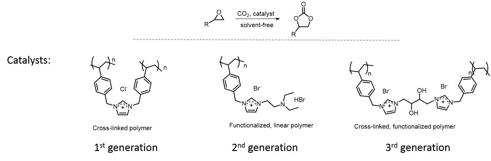 The synthesis of cyclic carbonates from epoxides and CO2 (CCE reaction) is an atom-efficient, scalable reaction of industrial importance. It is an important example of a catalytic reaction highlighting the utilization of CO2 as a building block. Numerous catalysts (both metallic and metal-free)[1] have been proposed for this reaction, and in particular, ionic liquids and ionic polymers have emerged as a class of potent catalysts in this transformation. In our group, we have prepared imidazolium-based polymers (Fig. 1) incorporating functional groups that are potent catalysts for the CCE reaction.[2-4]