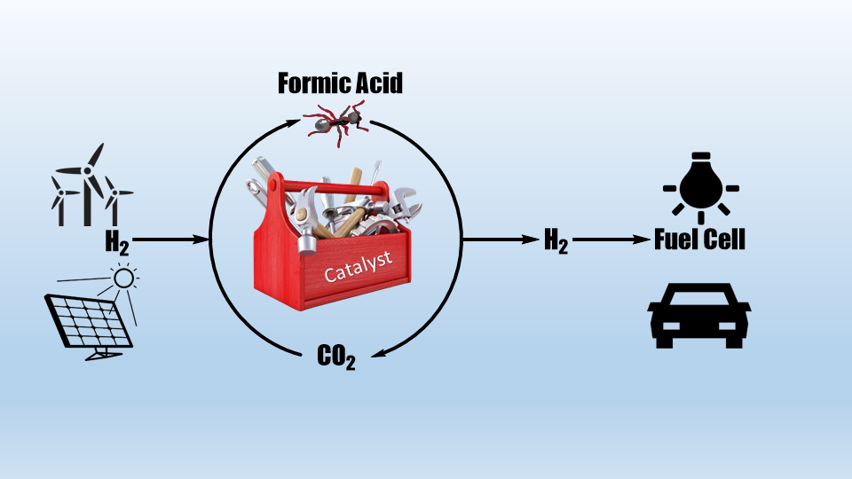 Hydrogen is, among others, widely known as a renewable and clean energy source, more precisely an energy vector. However, it is less known that the storage of hydrogen is not so evident. Indeed, the current methods to store hydrogen habitually involve high pressure (stainless steel) cylinder, having weight and safety issues, [1] not easy to handle, having obvious hazards. In order to imagine a general use of hydrogen as an energy carrier, other storage methods should be developed.[2] The principle idea would be to use renewable energy sources such as solar or wind to produce hydrogen, store it chemically bounded in small organic molecules such as formic acid, deliver it on demand and then start the cycle again, thus being CO2 neutral if one can reuse the CO2 released in the process.