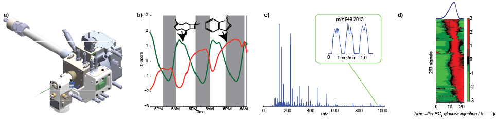 The analysis of trace gases is of paramount importance in a wide range of applications. We have developed analytical instrumentation to address these needs. A secondary electrospray ionization source has been constructed and tested to detect vapors in metabolomics applications.[1] Ion source development: Figure 1a shows the ion source developed in collaboration between ETH and an industrial partner. The geometry has been numerically optimized to analyze continuous gas flows as low as 0.5 L/min. Plant emissions: Figure 1 b shows two examples of real-time traces captured during monitoring of plant emissions during the course of three consecutive days.[2] Breath analysis: Figure 1c shows a breath mass spectrum, whereby new species as high as m/z 949.2 were detected for the first time.[3] Yeast volatile metabolomics: Figure 1d displays a heatmap showing 263 time-dependent signals detected in vivo during yeast growth. For reference, the ethanol signal is shown on the top. We conclude that commercial atmospheric pressure ionization mass spectrometers can be upgraded into sensitive real-time sniffers for a variety of applications.
